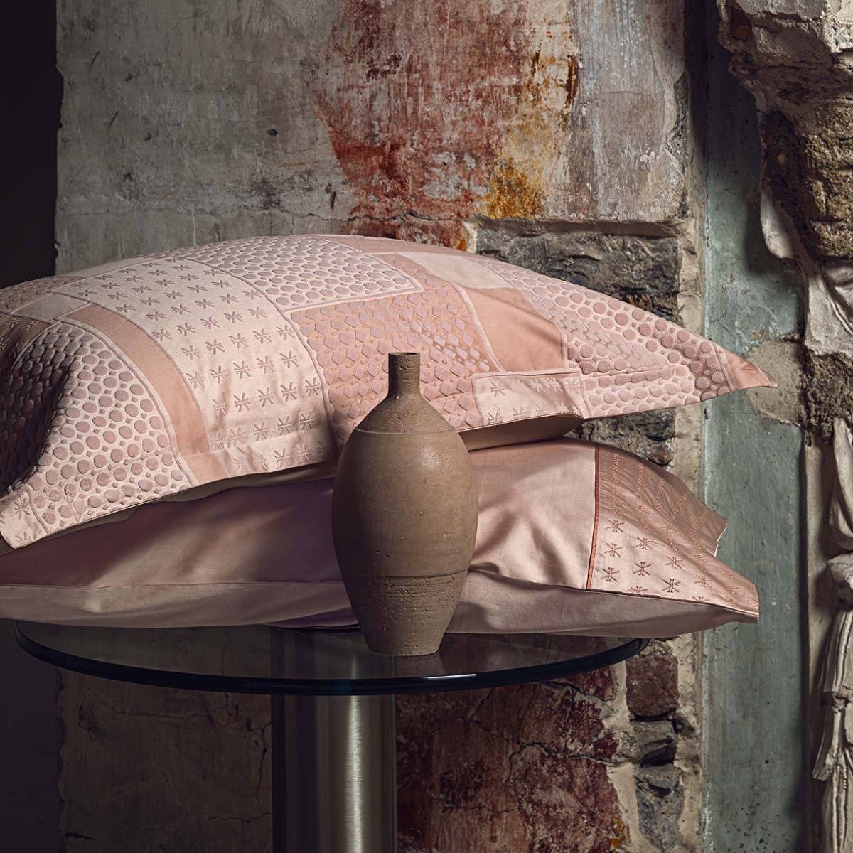 La preziosa ed importante balza di raso 300TC finemente ricamata, rifinita da codina a contrasto, è applicata a mano su federe e lenzuolo in percalle di puro cotone tinta unita come il lenzuolo con angoli.