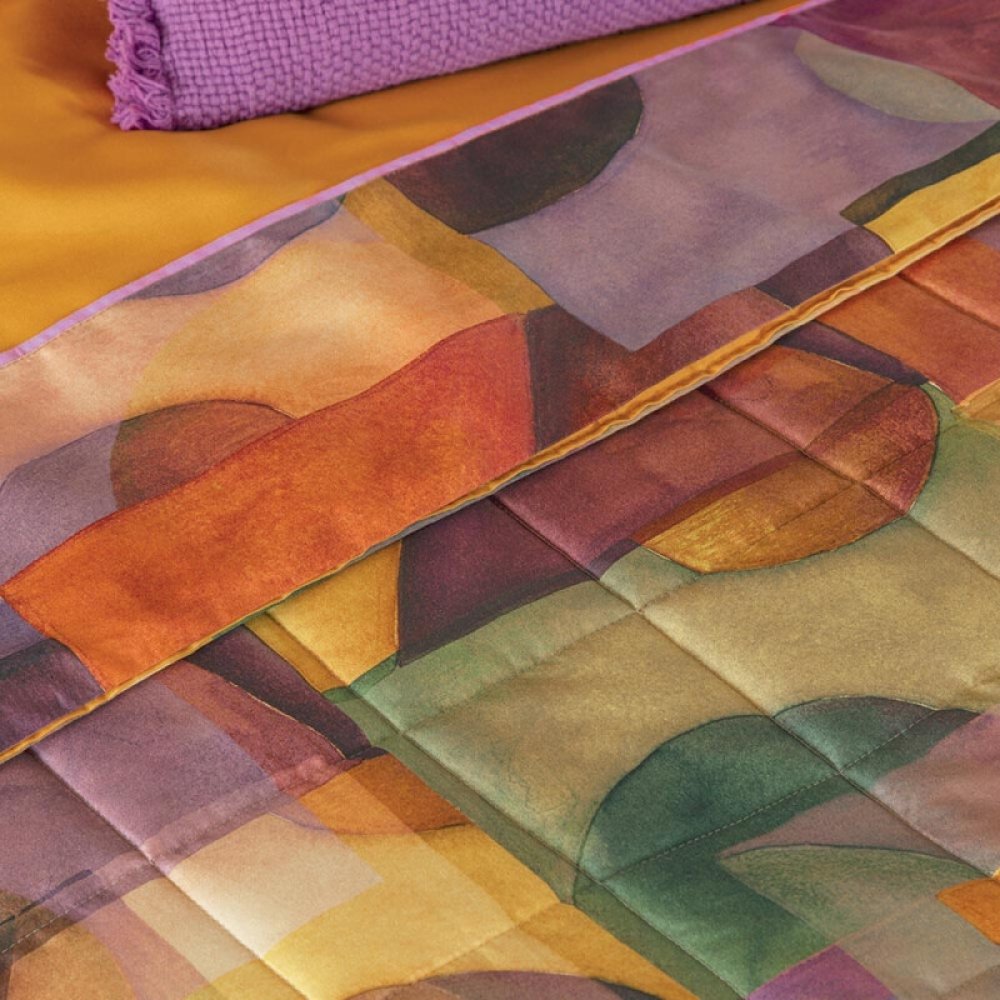Le federe e l'alta balza del lenzuolo, impreziosita da codina a contrasto, sono in percalle di puro cotone stampato in digitale. Il resto del completo è in percalle di puro cotone tinta unita.
