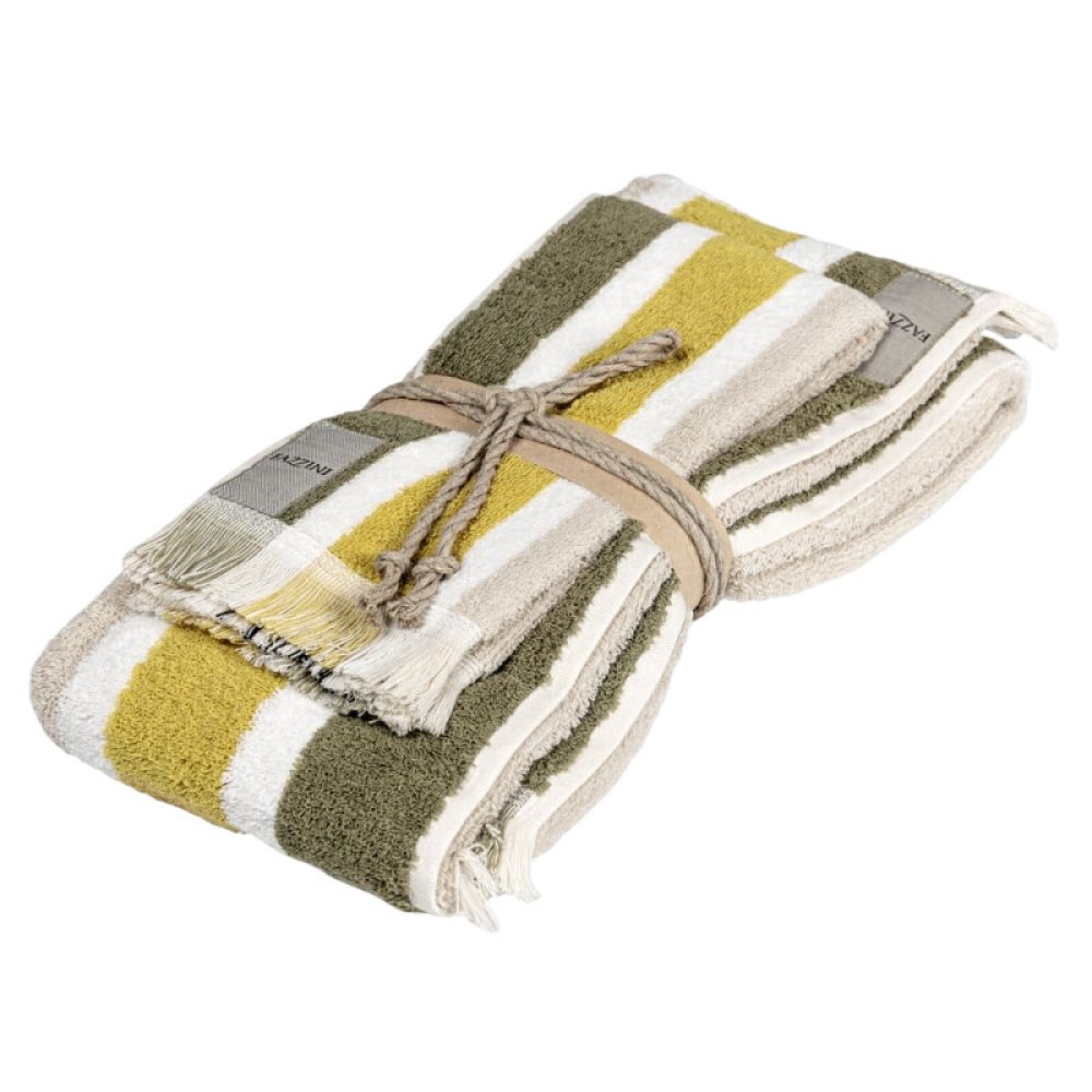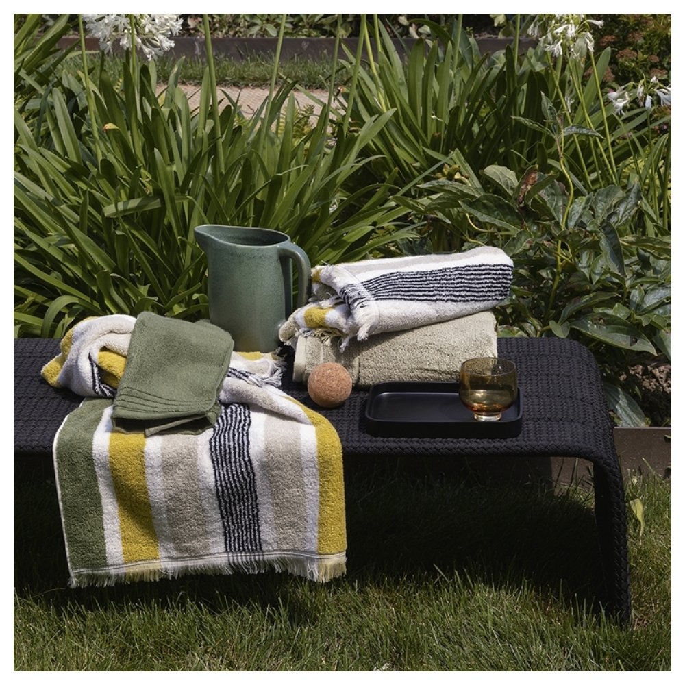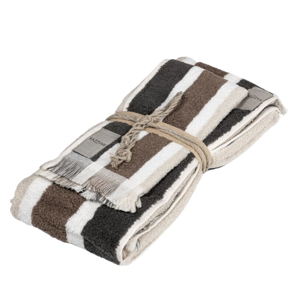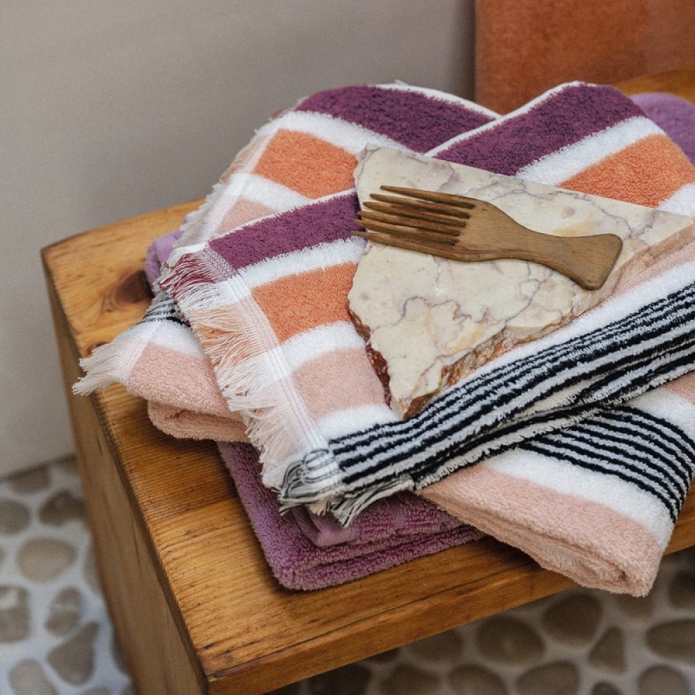 Realizzata in cotone di qualità tinto in filo, la spugna Gradazioni si aricchisce di nuovi colori per accostarsi alle differenti stagioni con il suo sempre attuale motivo a righe.